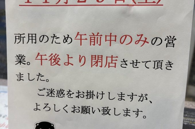 誠に勝手ながら、店主入院のため、8月11日まで臨時休業とさせていただきます。 お客様にはご不便をおかけいたしますが、何卒ご理解のほどよろしくお願いいた...