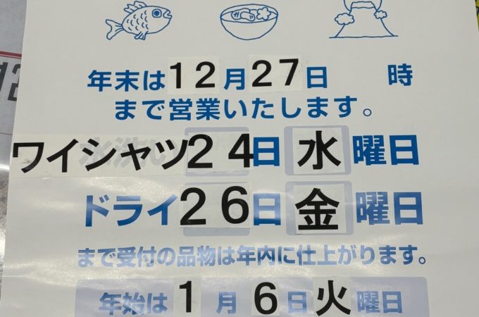 12月28日〜1月5日までお正月休みとなります。 以前にもお伝えしましたが、 宅配クリーニングの年内仕上げお届けの締め切りは 「12月6...