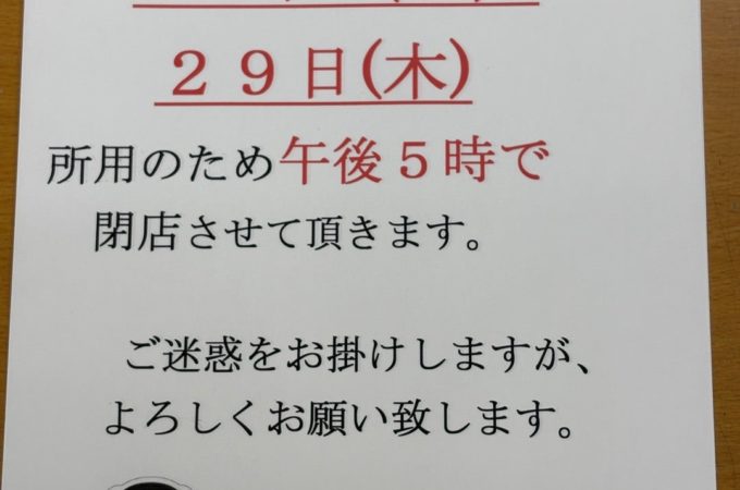 16日と29日は午後5時までの営業です。 よろしくお願いします。