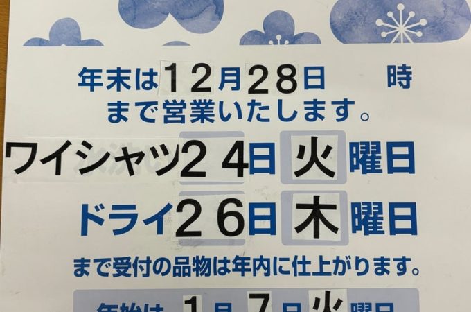 年末年始の営業と最終受付のご案内です。 まず、12月29日〜1月6日まで年末年始休業とさせていただきます。 次に最終受付のご案内。 ...